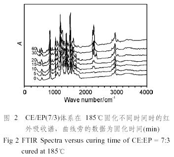 將氰酸酯樹脂/環氧樹脂(質量比為7:3)共混物用丙酮溶解,溶液涂于KBr鹽片上,置于設定溫度的烘箱中固化,等溫固化的溫度有:160℃、185℃、200℃,固化一定的時間后用德國Bruker公司的Vector-22型傅立葉變換紅外光譜儀測量其紅外光譜(FTIR)。