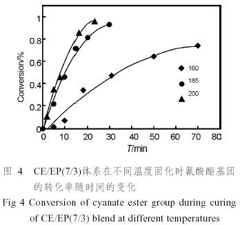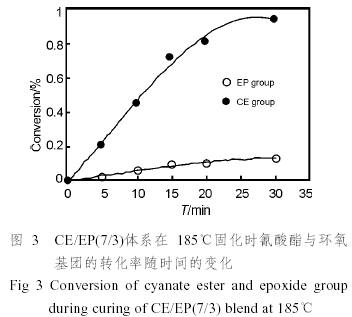 從圖中還可以得知,在固化的過程中,氰酸酯樹脂的反應速率要遠遠大于環氧樹脂的反應速率,如在185℃反應30min時,氰酸酯樹脂的轉化率已經大于90%,而環氧樹脂的轉化率則仍只有10%左右。