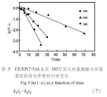 根據不同溫度下的轉化率(圖4),計算各溫度時的ln(1−α),并對時間t作圖,可以得到一系列直線(圖5),因此固化過程中氰酸酯基和環氧基的反應都屬于一級反應。