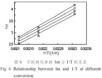從ln(1−α) ~ t圖中得到固定轉化率時的t和T,取了不同轉化率時的lnt對1/T作圖,得到一系列直線(見圖6),從直線的斜率就可以求得活化能E為55.5kJ/mol。與DSC法得到的活化能60.8 kJ/mol比較接近。