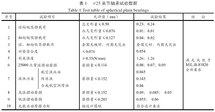 應用PTFE纖維織物的自潤滑關節軸承(以φ25軸承為例),經按MIL-B-81820全部要求試驗考核,結果如下: