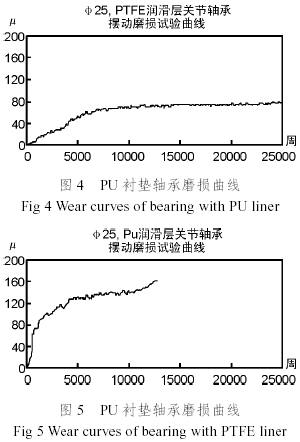 用相同規格,分別使用PU銅網與PTFE纖維為潤滑材料的兩種軸承,按相同條件完成多組擺動磨損試驗進行對比試驗,其中一組的試驗結果見圖4、圖5。