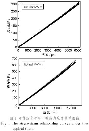 最大應變為6000µε和13000µε兩種情況下的試件應力-應變關系曲線分別如圖1(a)、(b)所示。可以看出,在兩種應力水平下,試件的應力和應變均為線彈性關系,且試件的彈性模量隨荷載循環次數增加并沒有顯著變化。