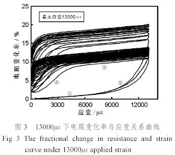 圖3為試件應變控制在13000µε之內時的電阻變化率與應變的關系曲線。從圖中可以看出,在較高應變水平下,試件的電阻變化率和應變關系曲線同低應變水平相比差別很大,在荷載作用的初期,電阻變化率隨應變的變化很小,在約8000~10000處尚不足5%;而在加載后期,電阻變化率隨荷載的增加急劇增大,最大應變處的電阻變化率大約在10%~20%之間。首次卸載的曲線形狀與首次加載也完全不同,具體表現為高應力水平時,電阻變化率隨應變變化較小,而低應力水平時,電阻變化率隨應變變化較大。在接下來的荷載循環中,加載和卸載的曲線形狀均相似,但也與首次加載不同。