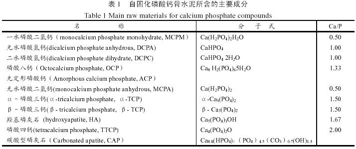 可注射骨水泥包括聚合物基和磷酸鈣基兩類,其中磷酸鈣基骨水泥又可分非自固化型和可自固化型。非自固化型磷酸鈣骨水泥與自固化型磷酸鈣骨水泥相比,最大的差別是其植入到體內不發生自固化反應。目前典型的可注射非自固化骨水泥是雙相磷酸鈣(biphasic calcium phosphate,簡稱BCP)骨替代材料。自固化型骨水泥被移植到體內后能夠在體液環境下自固化,最終水化形成羥基磷灰石。根據現有文獻報道,自固化骨水泥的主要原料成分如表1所示。