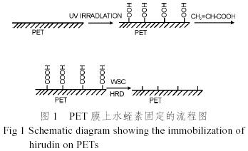 將PET膜浸入減壓蒸餾過的10%(質量分數)丙烯酸溶液中,并通入1h氮氣以驅除反應阻拒劑氧,經紫外光輻照,取出薄膜清洗;將已接枝過聚丙烯酸的PET膜浸泡在80mg1-乙基-3-二甲基酰氨基醛碳二亞胺(WSC)/80ml檸檬酸鈉溶液中5h后用蒸餾水清洗干凈,置于水蛭素溶液中24h。薄膜取出后用超聲波蒸餾水清洗,處于凈化室中室溫干燥。樣品編號為PET-HRD。反應流程如圖1所示。