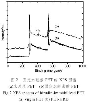 圖2為PET膜固定水蛭素前后的XPS圖譜。可以看出,固定水蛭素之后的PET薄膜表面在286eV,400eV,532eV分別有3個峰。分別對應于C1s峰,N1s峰,和O1s峰。因為PET膜只含有C元素和O元素,沒有N元素,而固定了水蛭素的PET薄膜表面有N1s峰存在,可以證明PET膜表面成功地固定上了水蛭素分子。