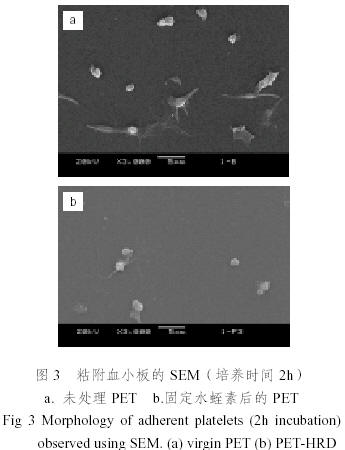 圖3為材料表面粘附的血小板掃描照片。可以看到,未改性的PET薄膜血小板聚集和變形程度很高,而固定了水蛭素分子的PET薄膜表面血小板聚集和變形程度降低。