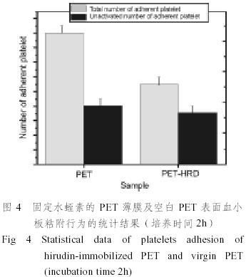 圖4為固定水蛭素的PET薄膜與空白PET薄膜表面血小板粘附行為的統計結果。固定水蛭素的PET薄膜表面粘附的血小板數量與未固定的PET薄膜相比顯著減少,未激活數量百分比也明顯高于未改性PET薄膜。這表明固定水蛭素分子的PET薄膜其血液相容性得到改善。可能的解釋是水蛭素能直接抑制凝血酶[4],與凝血酶1:1結合形成不可逆的復合物,從而使凝血酶失去作用[2,4]。水蛭素與凝血酶結合后,使凝血酶的蛋白酶解作用和與內皮細胞血栓調理素的結合作用受到抑制,進而使凝血酶誘導的血小扳聚集和釋放功能受到抑制,從而表現出良好的抗凝效果[4]。