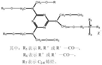 這類染料或改性后的產品在墨水中應用也日益受到重視。Domingo等[11]通過把硫化染料隱色體與陽離子試劑反應制得不溶性的硫化顏料,然后加水性樹脂等添加劑制成墨水。所用的硫化染料隱色體有C.I.隱色體硫化黑1,C.I. 隱色體硫化黑2,C.I. 隱色體硫化黑18;C.I. 隱色體硫化紅10,C.I. 隱色體硫化紅14,C.I. 隱色體硫化藍3,C.I. 隱色體硫化藍7,C.I. 隱色體硫化藍11,C.I. 隱色體硫化藍13,C.I. 隱色體硫化藍15,C.I. 隱色體硫化藍20;C.I.隱色體硫化黃9,C.I. 隱色體硫化黃22等。在硫化顏料的制備中,所用的陽離子試劑結構如下: