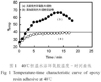 我們通過不同溫度下環氧膠固化的對比試驗,選定室溫40℃作為恒溫固化試驗的反應溫度。測定CH6型環氧膠(A組份)40℃恒溫的溫度-時間曲線a及CH6型環氧膠A、B組份混合后固化反應溫度-時間曲線b,得到結果如圖1所示。a是A組份由室溫逐漸升溫達到40℃,表明這是一個A組份在恒溫水浴中加熱并最終達到熱平衡的過程。而b則是在溫度上達到26℃后升溫速度急劇加快,為固化反應放熱和水浴加熱共同作用的結果。此試驗說明CH6型環氧膠固化反應開始的溫度為26℃。