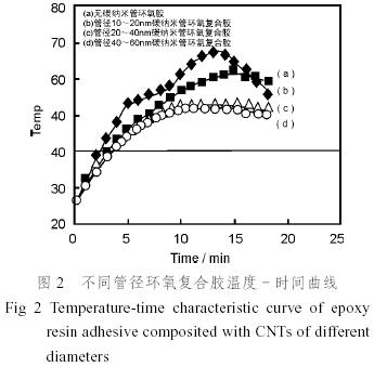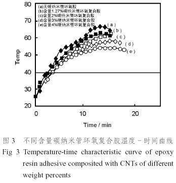 參照GB7193.4-87方法稱取試樣各25g,作恒溫40℃時碳納米管復合環氧膠反應活性試驗,記錄試樣反應溫度-時間曲線,測定反應最高放熱溫度及最短固化時間。