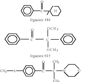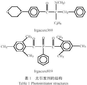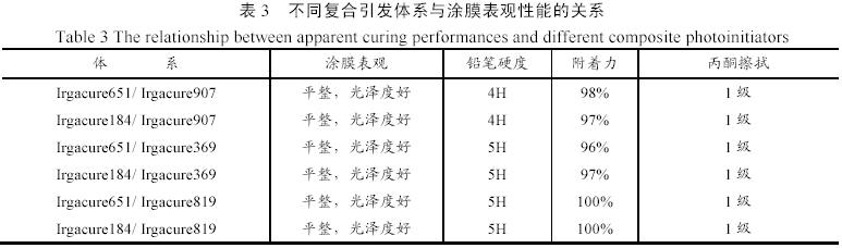 將表1 5 種光引發劑,即提高有色體系表干性能的Irgacure651 和Irgacure184 和提高有色體系里干性