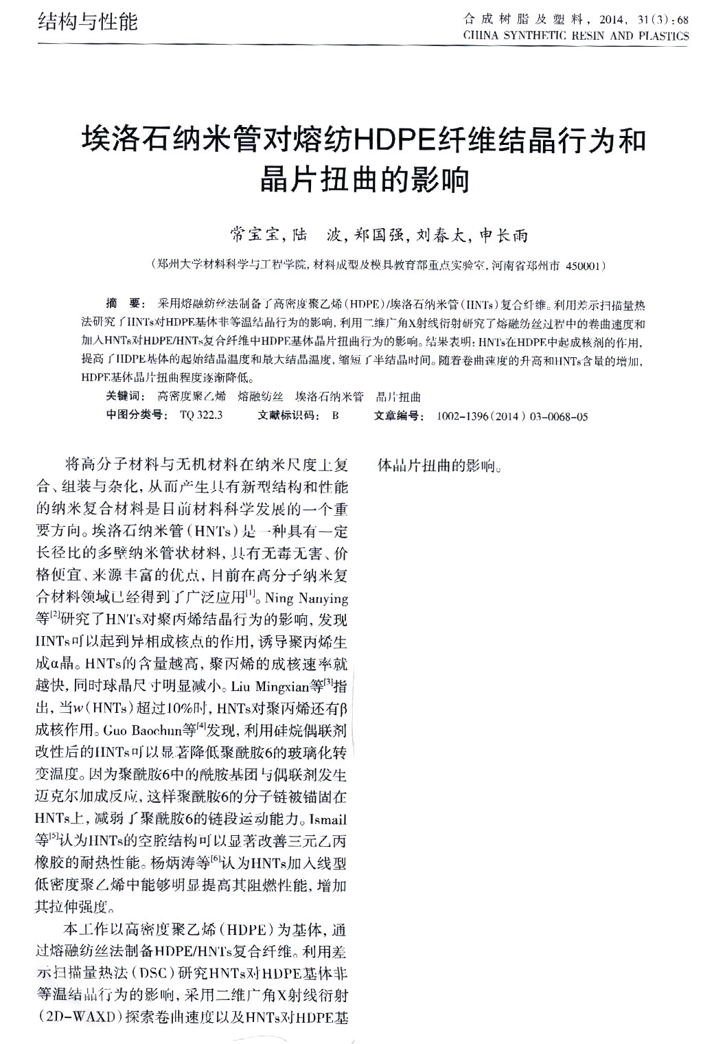 埃洛石納米管對熔紡HDPE纖維結晶行為和晶片扭曲的影響