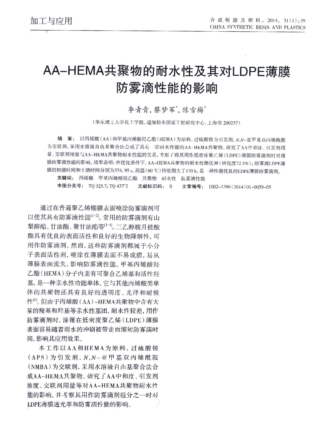 以丙烯酸(AA)和甲基丙烯酸羥乙酯(HEMA)為原料,過(guò)硫酸銨為引發(fā)劑,N2N-亞甲基雙丙烯酰胺為交聯(lián)劑,采用水溶液自由基聚合法合成了具有一定耐水性能的AA-HWMA共聚物。研究了AA中和度、引發(fā)劑用量、交聯(lián)劑用量與AA-HWMA共聚物耐水性能的關(guān)系,考察了將其用作地低密度聚乙烯(LDPE)薄膜防霧滴劑時(shí)對(duì)薄膜防霧滴性結(jié)果表明:在優(yōu)化條件下,AA-HWMA共聚物的耐水性能優(yōu)異(固化度72.5%);防霧滴LDPE薄膜的初滴時(shí)間和十滴時(shí)間分辨為374.95s,高溫(60。C)持效期大于170h,是一種性能優(yōu)良的LDPE薄膜防霧滴劑。