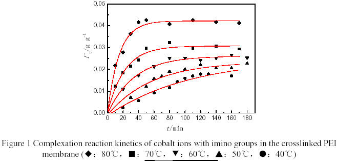 Figure 1 showed the relationship between the amount of cobalt ions complexed with imino groups in the crosslinked PEI membrane (Γt) and time (t). It was found that Γt obeyed the first order kinetics curve, and the higher of the temperature, the rapider of the complex reaction. The activation energy of the complex reaction was estimated to be 62.14 kJ/mol according to the change of the reaction rate with the temperature.