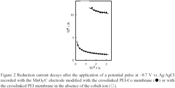 A cobalt complex with a cross-linked PEI ligand was prepared according to the method described in the literature5 with slight modifications as follows. A solution of PECH and PEI in DMF was heated to 60 ℃ slowly enough to prevent gelation, and then the hot solution was transferred onto the surface of a glassy plate. The solvent was allowed to evaporate at 100 ℃ for 2 h. Washing the product with methanol followed by drying under vacuum afforded the transparent membrane of the crosslinked PEI ligand. The membrane was dipped into the cobalt(II) chloride solution to complex the cobalt ions to the imino groups. The amount of cobalt ions in the polymeric complex was estimated by spectral analysis and a Nikko Keisoku DPGS-1 dual potentiogalvanostat and a Nikko Keisoku NFG-3 universal programmer were employed to obtain the current decay curves in potential step experiments.