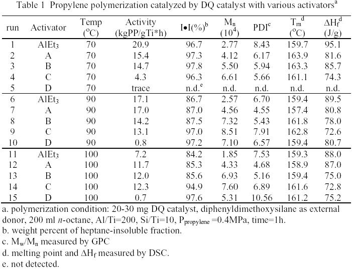 Several papers reported the propylene polymerization at the temperature higher than 70°C. Kojoh et al.1 reported that the activity and molecular weight dropped in the propylene polymerization at 100°C using MgCl2-TiCl4-dioctylphthalate catalyst in combination with alkylaluminum and diphenyldimethoxysilane. The activity and molecular weight obtained with Ali-Bu3 were higher than that with AlEt3. Hoeg and Liebman2 reported in propylene polymerization from 75 to 175°C using TiCl3-AlR3 catalyst system, the proportions of isotactic polymer with AlEt3 were higher than with Ali-Bu3. Zhong et al.3 investigated the effect of high polymerization temperature on the microstructure of isotactic polypropylene prepared by MgCl2-TiCl4-9,9-bis(methoxymethyl)fluorine activated by both Et3Al and i- Bu3Al without external donor.