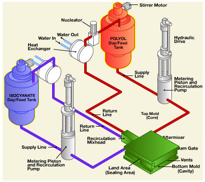 反應注塑設備最初由德國研制,現由多家廠商銷售。反應注塑系統的基本元件包括:狀態調理系統,用於準備液態中間體;計量泵系統,確保以規定的數量和壓力泵送中間體;一個或多個混合機頭,通過撞流混合方式混合液態中間體;載模架,使模具按要求取向,適時開模和合模,便於清潔和脫模。