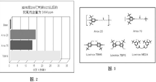 在OIT評估中,一種不穩定的"基本"系統電線電纜用高密度聚乙烯(HDPE)在200℃時的氧化時間為零。總共只有百萬分之1000(1000ppm)的抗氧化劑表現出明顯的不同。當Anox 20的作用時間為14分鐘時,Anox 70的作用時間是12分鐘(見圖2.)。更高級的Lowinox TBM6的作用時間(30分鐘)表明其在這種應用情況下是一種非常高效的抗氧劑。在以前的文章中我們已經很深入地研究了Lowinox TBM6的作用時間很長的原因。圖3.顯示的是電線電纜中各種抗氧劑的化學結構。