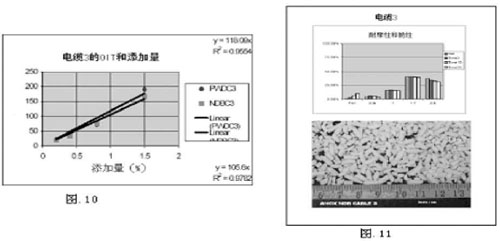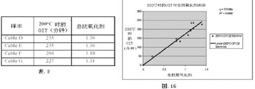 有多種方法可以評估電纜中穩定劑的性能。長時間熱老化(LTHA)是一種評估電纜壽命的普通方法。將電纜放入80-120℃的烘箱中一段時間以后可以發現其物理缺陷。通常情況下,低溫更容易實現,但需長時間采集數據。高溫情況下暴露缺陷的時間很短,但高溫的應用顯示出在很多由溫度上升過程中發生大量化學副作用所帶來的問題。氧化誘導時間(OIT)是一種熔融溫度下的儀器測量方法。因此,OIT仍然非常迅速(大約30秒),但缺少系統預報性,事先沒有表現出來。經常對成品做熱試驗。生產過程及與UV穩定性相對應的長時間熱穩定性也非常重要,經過不同的老化條件后可以測量出諸如顏色、光澤、拉伸性能等物理特性。