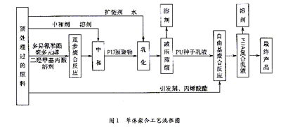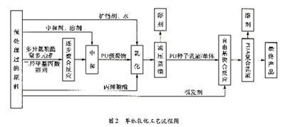 先將二異氰酸酯、聚多元醇、醇擴鏈劑和親水性擴鏈劑等進行逐步聚合反應,中和成鹽后制得預聚物/單體(P/M)混合物,再用胺擴鏈劑擴鏈,制得PU種子乳液/單體混合物,最后以PU乳液為種子,加入引發劑(必要時加入少量乳化劑),自由基乳液聚合,制得PUA乳液。具體工藝流程見圖2。