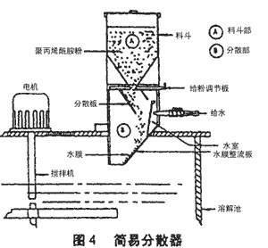 在溶解時,如果只是簡單地將聚丙烯酰胺投入水中,就會形成塊狀,即使長時間攪拌也不溶解,不僅是徒勞,而且容易造成投加系統堵塞事故。因此一般采用分散器溶解水和粉末接觸分散呈薄膜狀態。在自動送粉器中,一般裝有分散器。在用手工分散時,使用如圖4所未的簡易分散器。