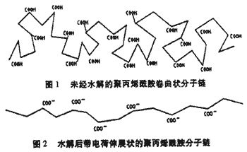 在溶解聚丙烯酰胺的同時加入一定比例的氫氧化鈉,溶解后放置8h左右使它充分水解(堿化),經水解后可使聚丙烯酰胺卷曲的高分子鏈充分伸展開,見圖1和圖2。伸展的聚丙烯酰胺高分子長鏈大大地增加了它和細小礬花顆粒相碰和吸附的機會,使聚丙烯酰胺的吸附架橋網捕作用得到充分的發揮,從而進一步提高助凝效果。從生產實際應用的經驗表明,現配現用的水解化(堿化比)要大一些,一般選用1:0.2為宜,即1g聚丙烯酰胺加入0.2g氫氧化鈉。如果水解時間能滿足8h,水解比應選用1:0.01--1:0.05。水解比過大會造成凈化后的水質pH值嚴重升高。如果使用水解度為30%以上的陰離子型聚丙烯酰胺,即可免水解步驟。