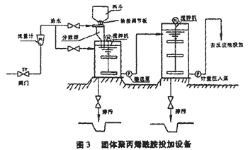 在生產實際應用中,使用粉末狀的固體聚丙烯酰胺高分子助凝劑,通常用自動送粉器或簡易分散器等定量送粉,使其在一定量的水中分散溶解之后,再通過計量泵投加到反應池中。其一般的流程見圖3。