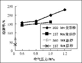 圖.1 空氣壓力和涂塑率之間的關(guān)系變形紗和原紗涂塑率的比較