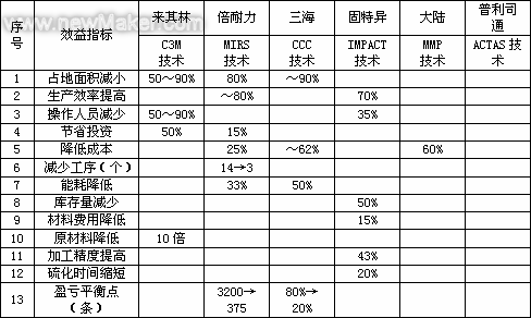 與傳統(tǒng)的輪胎制造工藝技術(shù)相比,上述全新概念工藝技術(shù)普遍具有節(jié)省投資、設(shè)備占地面積少、生產(chǎn)效率高、降低成本的優(yōu)勢,詳見表1。