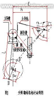 據文獻介紹,升降翻轉運動形式分為:間接導向的升降翻轉運動;直接導向的升降翻轉運動;單槽杠桿導向的升降翻轉運動。其中最常用也最簡單的是直接導向的升降翻轉運動。單槽杠桿導向的升降翻轉運動在大規格B型定型硫化機如1900B,2160B等機型上曾經使用過,但已逐漸被直接導向的升降翻轉運動取代。而間接導向的升降翻轉運動在國內的定型硫化機上尚未見使用。本文介紹的升降翻轉型運動就是直接導向的升降翻轉型運動。圖一為其機構運動簡圖。為做圖和敘述方便,圖中略去了橫梁端軸外的主導輪和副連桿上的副導輪,直接討論橫梁端軸的運動。