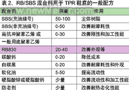 表2列出了RB/SBS混合料用于TPR鞋底的常見配方及其作用,而表3則列出了JSR RB添加比例的不同及其物理化學性能。數據表明,加入JSR RB830后,SBS粒料的物理性能(拉伸強度等)和化學性能(耐臭氧性能)及試樣的外觀都有一定的改善;而用JSR RB840與特定牌號的SBS共混后,其耐磨耗性和其他物性都要優于未添加RB的SBS粒料。