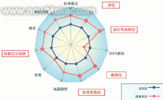 在SBS粒料中添加RB,不僅可以改進TPR鞋底的外觀,還可以改進其他物理化學性能,如圖5所示。