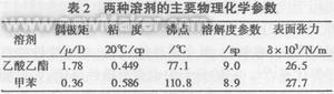 聚苯乙烯泡沫塑料溶解于芳烴(如苯,甲苯,二甲苯等),氯代烴(如三氯甲烷,三氯乙烯),羧酸酯(如乙酸乙酯,乙酸丁酯),酮(如丙酮,丁酮)等大部分有機(jī)溶劑中。選擇合適的溶劑溶解泡沫塑料,主要從以下幾個(gè)方面考慮:首先,所選擇的溶劑要對聚苯乙烯及新加入的改性劑有良好的溶解能力,對添料有良好的分散性能;其次,溶劑的性質(zhì)最好對膠粘劑的性質(zhì)有一定的改善作用;第三,所選用的溶劑要低毒,價(jià)廉,易得,安全。綜合考慮以上各因素,用乙酸乙酯或甲苯作溶劑比較適合。但又考慮到混合溶劑的溶解性較單一溶劑要好,并且由于沸點(diǎn)、揮發(fā)度、極性不同,通過改變混合比例,可以調(diào)節(jié)膠粘劑的干燥時(shí)間,滿足不同場合的需要,因此,選擇了乙酸乙酯和甲苯二者混合作為聚苯乙烯泡沫塑料的溶劑,這兩種溶劑的物理化學(xué)參數(shù)見表2。