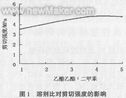 從圖中可以看出,隨著溶劑比的增大,也就是乙酸乙酯的比例上升時(shí),改性液的剪切強(qiáng)度增大,到溶劑比為4:1此后,又有所下降。其原因可能是由于乙酸乙酯的極性較大,一方面對賜有改性作用,另一方面,能與被粘材料的表面形成分子間的相互作用力,因此,提高了剪切強(qiáng)度;而且它揮發(fā)的較快,正好滿足了環(huán)氧樹脂固化以后殘留溶劑少,而提高剪切強(qiáng)度的要求。因此,它比例增大而膠液強(qiáng)度上升。但乙酸乙酯比例太大時(shí),由于它沸點(diǎn)低,揮發(fā)快,當(dāng)膠接邊緣固化以后,內(nèi)部的溶劑有可能長期處于液態(tài)或半固態(tài),影響粘接效果而使剪切強(qiáng)度略有下降。