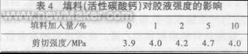 為了減小膠粘劑固化時(shí)體積收縮及對所粘基材不光滑的表面起到填充作用,降低膠液成本,在配方中可適當(dāng)加些添料,可添加活性碳酸鈣、滑石粉、二氧化鈦,效果良好,加入添料的數(shù)量對膠液性能的影響見表4