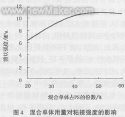 圖4是改性劑也就是混和單體用量對剪切強(qiáng)度的影響,從圖中看出,改性劑用量為PS的40%左右剪切度就已經(jīng)超過乳白膠的剪切強(qiáng)度了,活性單體共聚并與PS接枝,在聚苯乙烯鏈節(jié)上引入極性基團(tuán),對PS起改性作用。所以隨著混合單體增多,鏈節(jié)上極性基團(tuán)增加,因此剪切強(qiáng)度逐漸增大。混合單體再增多時(shí),剪切強(qiáng)度沒有太大的變化。有時(shí)可能由于交聯(lián)度增高而有所下降。況且單體越多成本越高,失去了廢物利用的意義,因此單體占PS的40%就足夠了。
