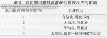 乳液共聚一般都選用陰離子-非離子表面活性劑為乳化體系,陰離子表活性劑選用十二烷基硫酸鈉,非離子表面活性劑選用OP-10,兩者比例為1:2,表8為乳化劑用量對膠液質(zhì)量的影響。