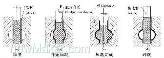擠脹成型的基本工藝過程如右圖所示。將管坯放入模具并在管坯內填入脹形介質(a);對管坯及其內部的脹形介質施加擠壓力F,使管坯材料在一定的應力狀態下變形(b);管坯在脹形介質產生的內壓作用下得到與模腔形狀相同的制件(c),卸載後脹形介質回復,取出成型制件(d)。