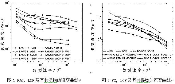 最近,對于以黏度較低的聚酰胺6(PA6)為基體的PA6/玻璃纖維(GF)/LCP、PA6/玻璃微珠(GB)/LCP(圖1),和以黏度較高的聚碳酸酯(PC)為基體的PC/GF/LCP、PC/GB/LCP(圖2),均發(fā)現(xiàn)了上述的流變混雜效應[3]。這些三元混雜體系的熔體黏度均比純樹脂和填充體系的低,甚至低于任一純樹脂或任一二元共混物的黏度[5]。