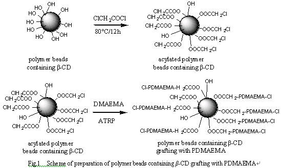 β-環(huán)糊精(β-Cyclodextrin, β-CD)是一個中空環(huán)狀低聚糖化合物,具有腔內(nèi)疏水、腔外親水的兩親性特點,并可與各種客體化合物形成超分子包合物[1]。β-環(huán)糊精經(jīng)高分子化后,具有獨特的物理化學性能,既能保持環(huán)糊精包結、緩釋、催化的能力,又兼具高聚物較好的機械強度和化學可調(diào)性等 [2]。環(huán)糊精高聚物作為藥物載體,可有效地應用于藥物控制釋放[3]。藥物通過與環(huán)糊精形成包合物可以提高其穩(wěn)定性和溶解性,以增強其生物利用度,緩解藥物對腸胃的刺激。但是,一般的β-CD高聚物不能對環(huán)境變化有響應性,因而不具有定向輸送藥物的特性。聚甲基丙烯酸-N,N-二甲氨基乙酯(PDMAEMA)是一種具有溫度和pH敏感性的高分子,分子結構中同時具有親水性的叔氨基、羰基和疏水性的烷基基團,當環(huán)境改變時會造成氫鍵的形成與破壞,從而導致高分子相態(tài)的變化。因此,嘗試把PDMAEMA鏈段接枝到β-CD微球表面,從而得到一種環(huán)境敏感性的β-CD微球用于藥物的控制釋放研究應是一項有意義的工作。從這一研究目的出發(fā),具體合成步驟為:首先采用反相微懸浮乳液聚合得到β-CD微球,然后對β-CD微球進行氯乙酰化的處理,最后通過原子轉移自由基聚合把PDMAEMA接枝到β-CD微球上(如圖1所示)。