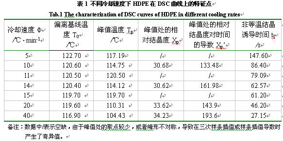 實驗采用中國石油大慶石化公司生長的高密度聚乙烯,PE-LA-50D012(5000S)。實驗時稱取約10mg樣品,在NETZSCH DSC204差示掃描量熱計上以10℃·min-1速度升溫到200℃,使樣品熔融,保持4min以消除樣品的熱歷史,分別在氮氣保護下用不同冷卻速度Φ=5、10、11、14、15、20、40℃·min-1冷卻至室溫20℃,得到七種不同降溫速率的DSC圖譜。