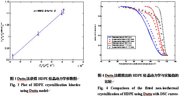 摘 要:通過差示掃描量熱法對高密度聚乙烯的非等溫結晶動力學進行了探討,引入非等溫結晶誘導時間后,比較了兩種能描述聚合物在變溫熱歷史下的結晶動力學,結果表明Nakamura法描述HDPE的結晶動力學與實驗一致性比Dutta法好。在Nakamura模型中,結合線性回歸分析和試差法,找到了能直接從非等溫結晶實驗中獲取HDPE的結晶動力學參數的方法。