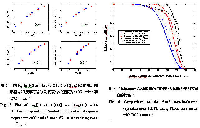 2)通過對HDPE在不同冷卻速度下結晶動力學的模擬值與DSC實驗值的比較,得到了兩種能描述聚合物在變溫熱歷史下的結晶動力學形式,即Dutta法和Nakamura法,發現Nakamura法的模擬值與實驗值具有更好的一致性。在Nakamura模型中,直接從HDPE的等速降溫DSC實驗上獲得了材料的結晶動力學參數,根據log[-log(1-X(t))]對logf(t) 作圖時與冷卻速度的無關性,找出了H-L方程中Kg的最佳值,進而確定了其它的動力學參數。