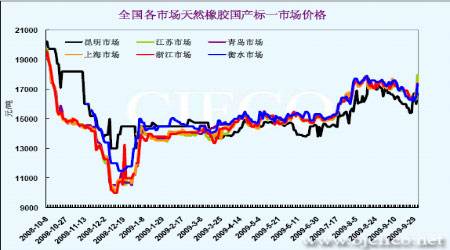 國內(nèi)天然橡膠現(xiàn)貨市場基本跟隨滬膠走勢,在8 月末之后的進一個半月內(nèi),各地現(xiàn)貨報價震蕩下行,國產(chǎn)標一最低曾至16200 元/噸附近,但長假前后,由于內(nèi)外盤期貨市場的強勢和東南亞現(xiàn)貨報價的大幅走高,國內(nèi)現(xiàn)貨價格也隨之猛漲,10 月9 日國產(chǎn)標一均價報17500 元/噸以上,較節(jié)前上漲了近1300 元。