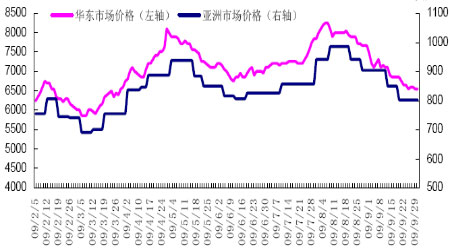 受上游量增價跌及下游產銷低迷拖累,整個9 月份PTA 現貨市場一瀉而下,較本月初跌900 元/噸,跌幅達12%。現貨PTA 市場延續8 月底下跌氣氛,因PTA 生產商利潤豐厚,裝置維持在9 成附近的較高水平,現貨PTA 市場貨源逐漸充斥市場,貨源繼續增加,聚酯大盤整體市場氣氛低迷,下游切片及滌絲全線下滑,實際交投氣氛平淡。至月末收盤,現貨PTA 市場受此影響,加之終端紡織品市場需求依然低迷,國內華東市場的一般現款自提貨報價和成交價位分別到6600 元/噸和6550 元/噸,較本月初下跌900 元/噸。外盤近洋現貨的一般報價和成交價位則分別在785 美元/噸和780 美元/噸附近,較本月初下跌100 美元/噸。