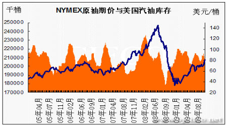 圖為NYMEX原油期價與美國汽油庫存走勢圖。(圖片來源:北京中期)