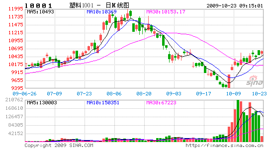 中石油和中石化有支撐市場的意愿,但在現貨和期貨市場持續弱勢的打壓下不斷下調出廠價格,從其價差的變化看,除少數時間外,出廠報價一直高于現貨均價和期貨價格,而期現價格也基本處于倒掛的格局,9月30日,連塑料出現報復性上漲,10月9日再次大漲,迅速扭轉了與現貨的倒掛局面。目前連塑料已收復萬元一線,并突破了5日和10日均線的壓制,逼近30日均線。