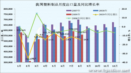 圖為2009年1-8月我國塑料制品月度出口量及增長率走勢圖。(圖片來源:海關總署)